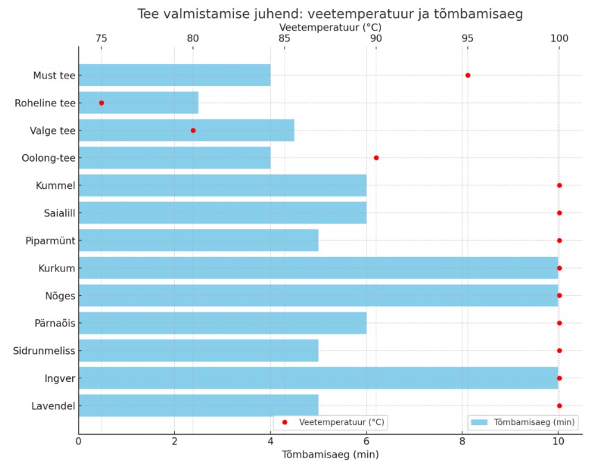 Taimetee valmistamisel tuleks järgida eri tõmbamisaegu – näiteks kummel ja piparmünt vajavad umbes 5–7 minutit, nõges ja ingver isegi kuni 10 minutit, et toimeained korralikult vabaneksid.